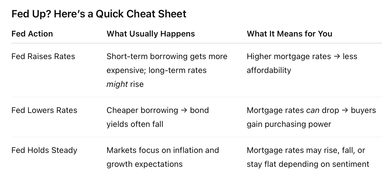 Because let’s be real — every time the news says, “The Fed raised rates again,” half the country panics, the other half shrugs, and most people have no clue what it really means for buying or selling a home in the greater Orlando area.